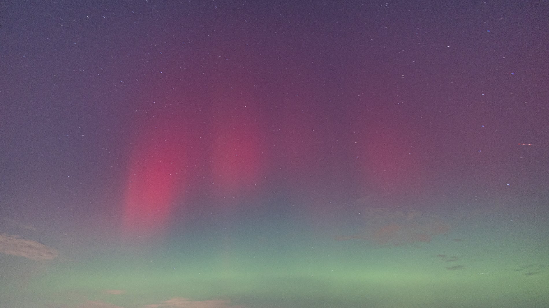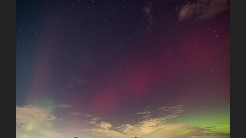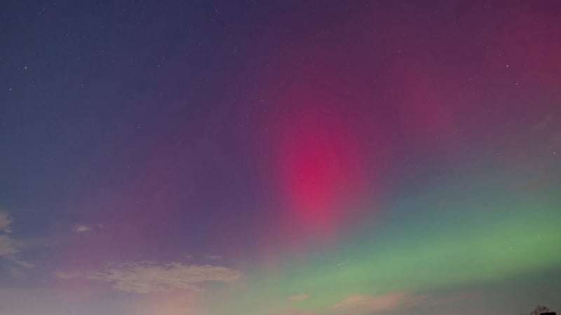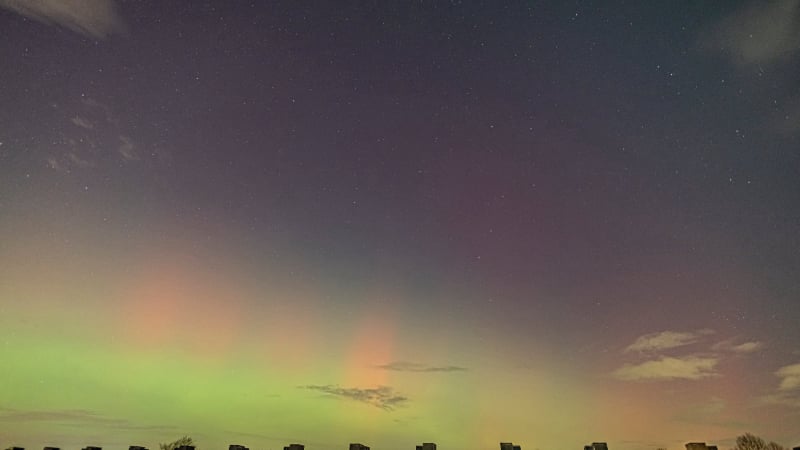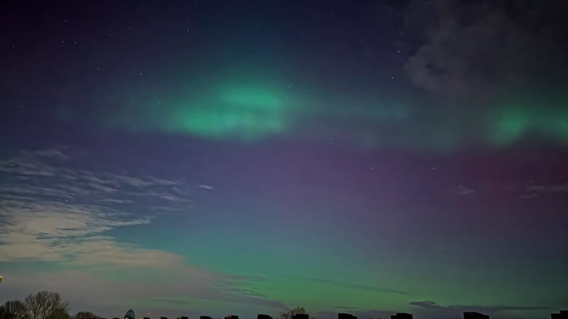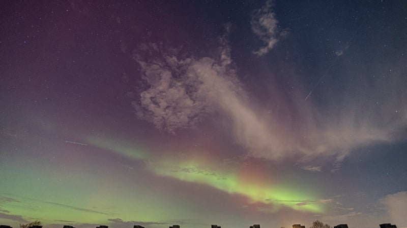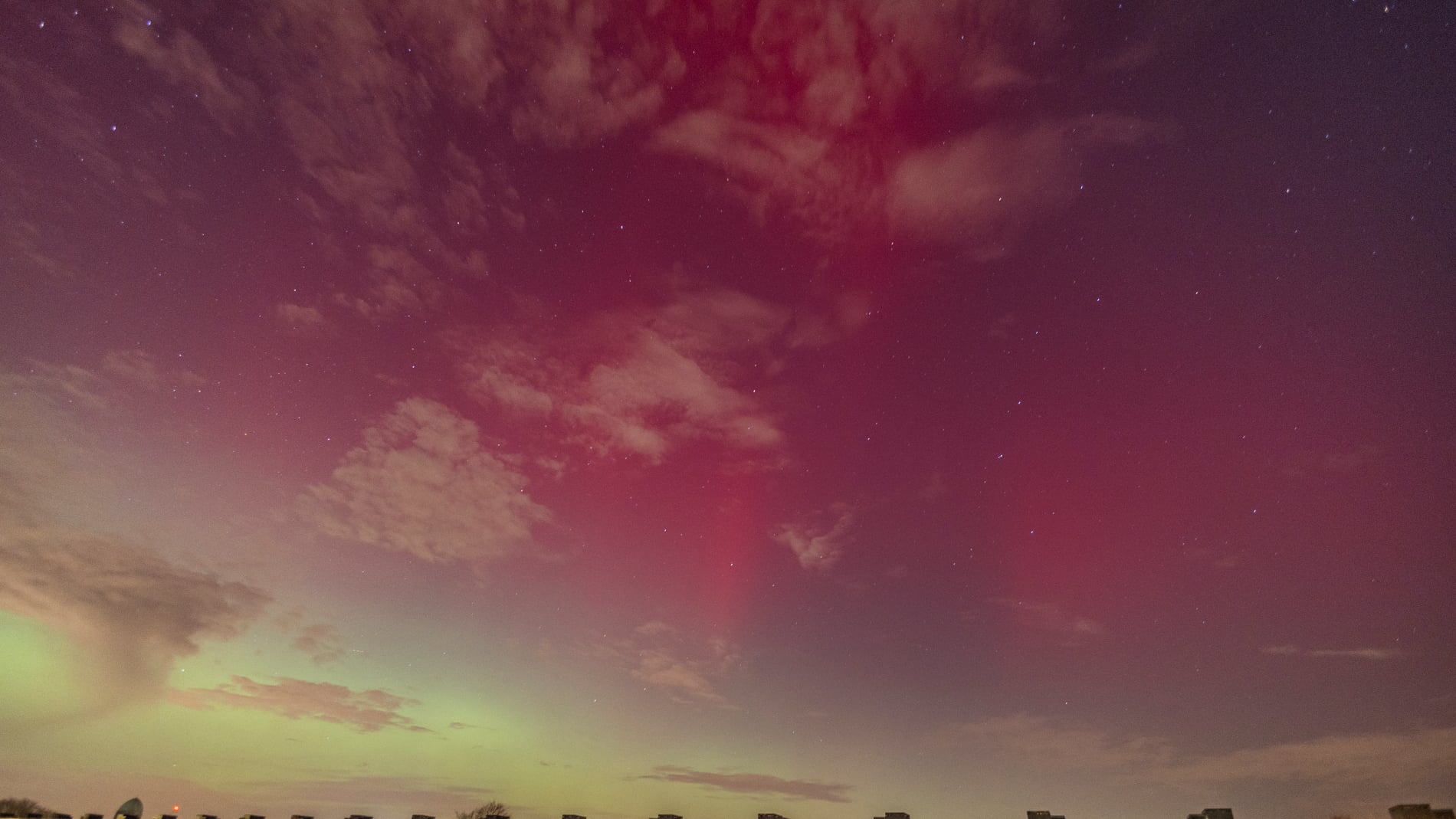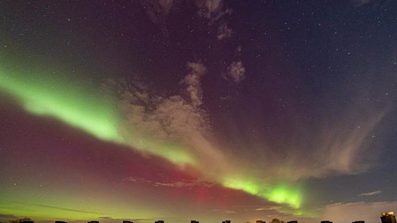 About 15 minutes later, the change was dramatic. The red aurora brightened and became clearly visible to the naked eye - even from within the city. That alone felt extraordinary, and it was clear the night had more in store. Soon after, a green band emerged, intensifying rapidly. Over the next fifteen minutes it climbed slowly higher, then split: one bright green arc remained fixed in the north, while even brighter green curtains formed above it, shimmering through the lingering red glow. These curtains drifted quickly across the northern sky.