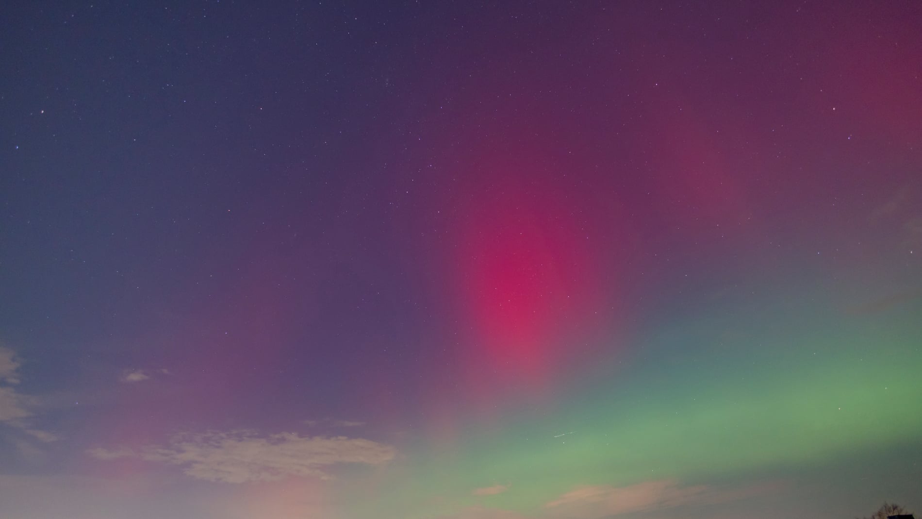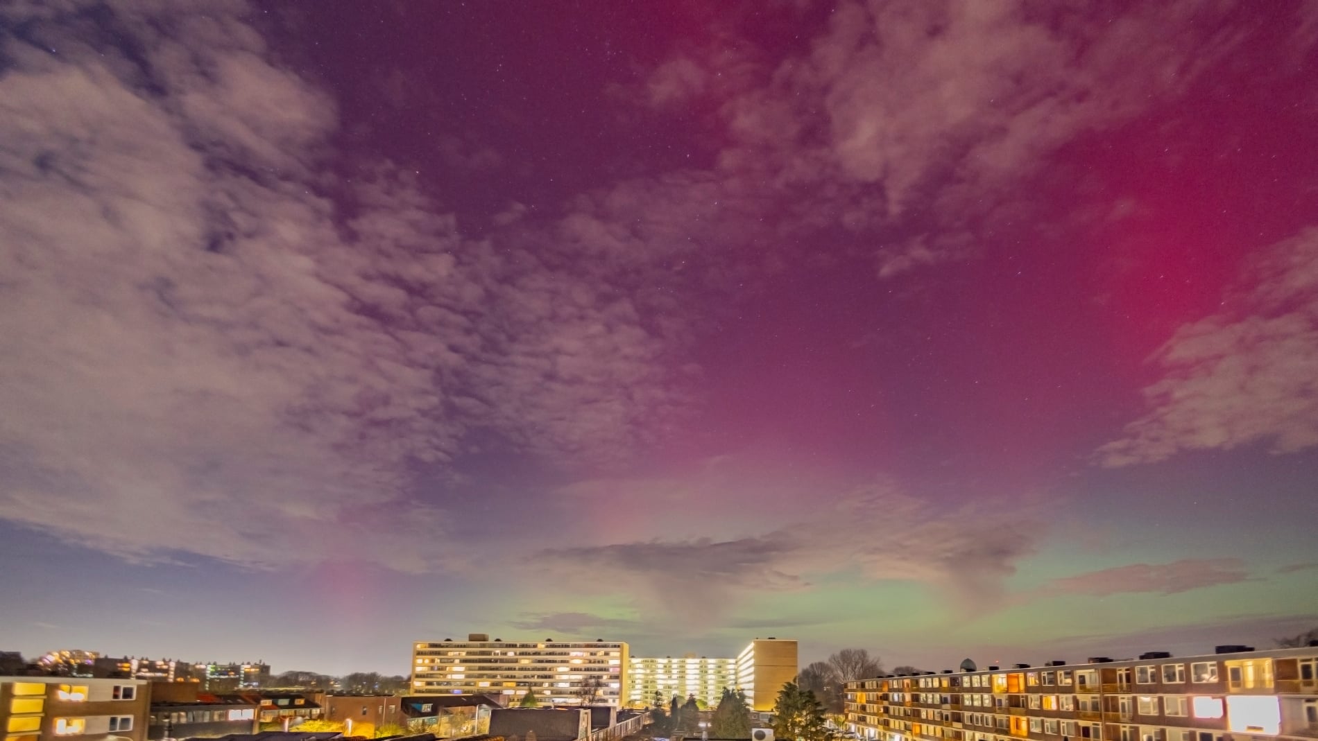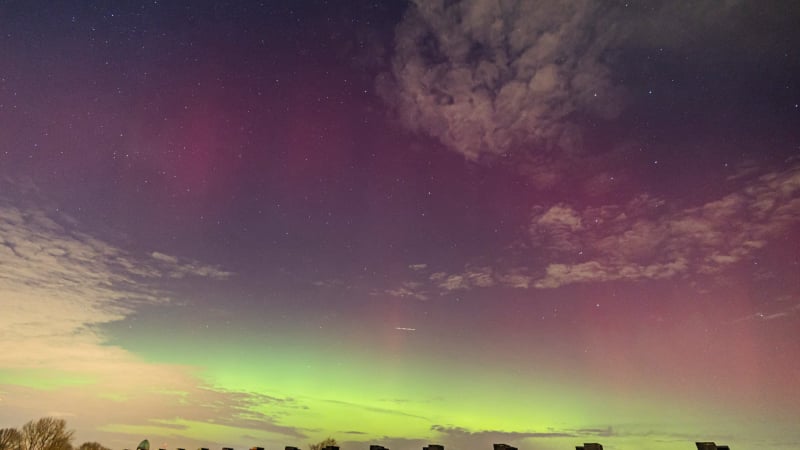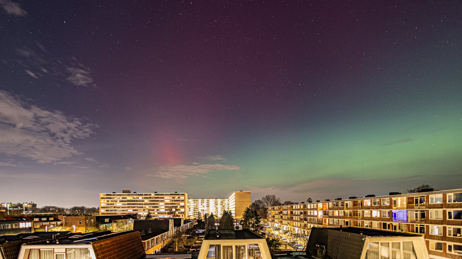 About 15 minutes later, the change was dramatic. The red aurora brightened and became clearly visible to the naked eye - even from within the city. That alone felt extraordinary, and it was clear the night had more in store. Soon after, a green band emerged, intensifying rapidly. Over the next fifteen minutes it climbed slowly higher, then split: one bright green arc remained fixed in the north, while even brighter green curtains formed above it, shimmering through the lingering red glow. These curtains drifted quickly across the northern sky.
