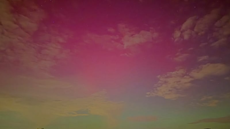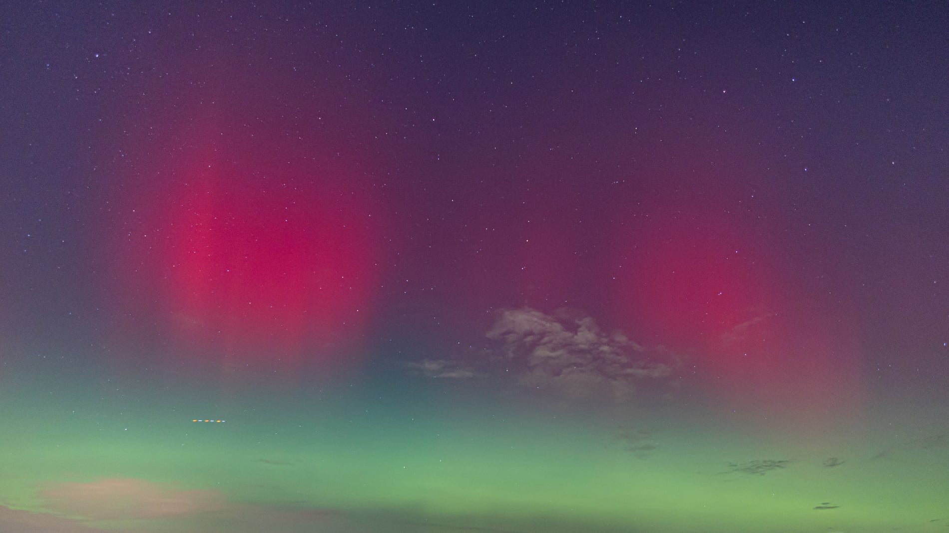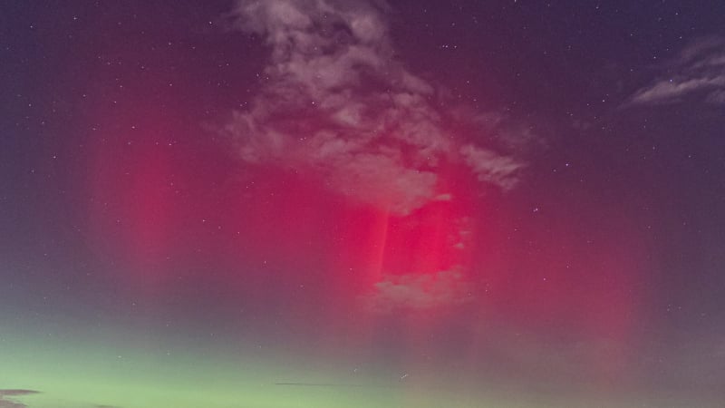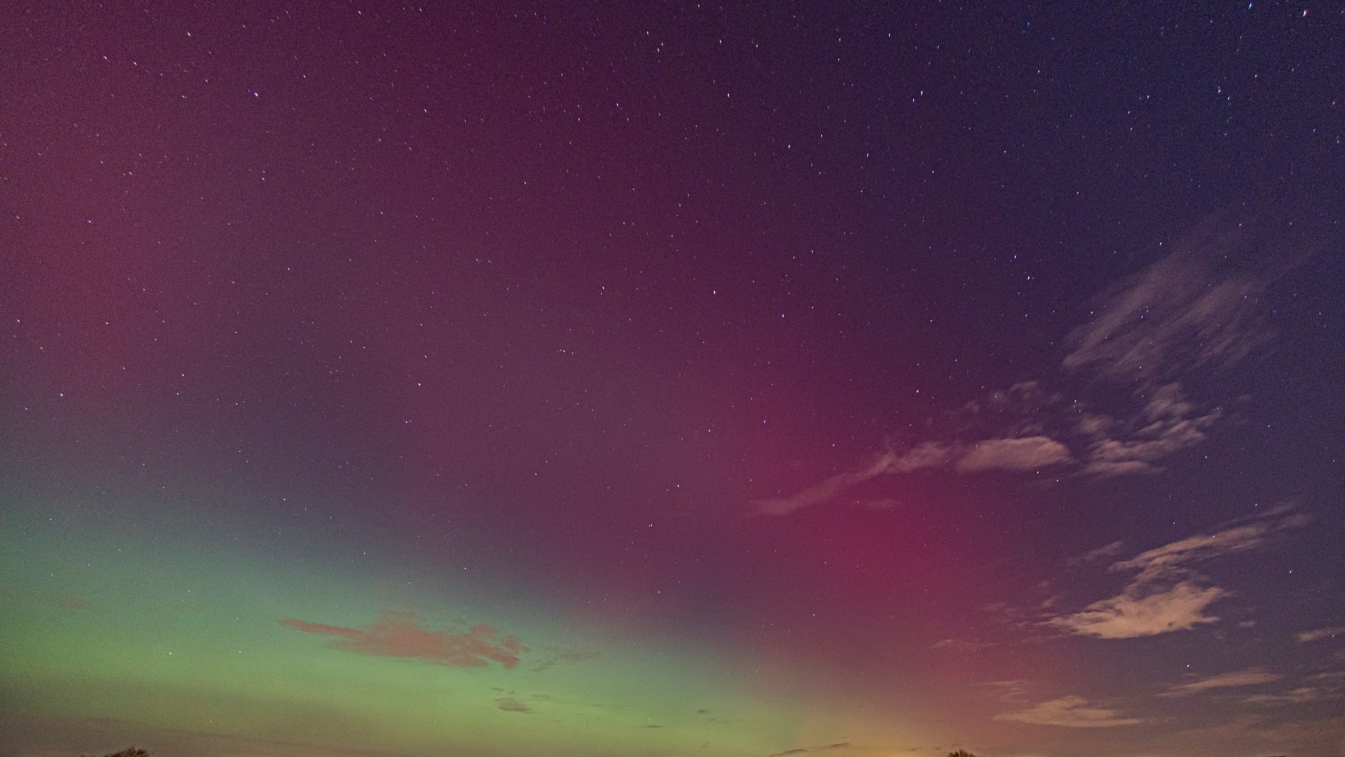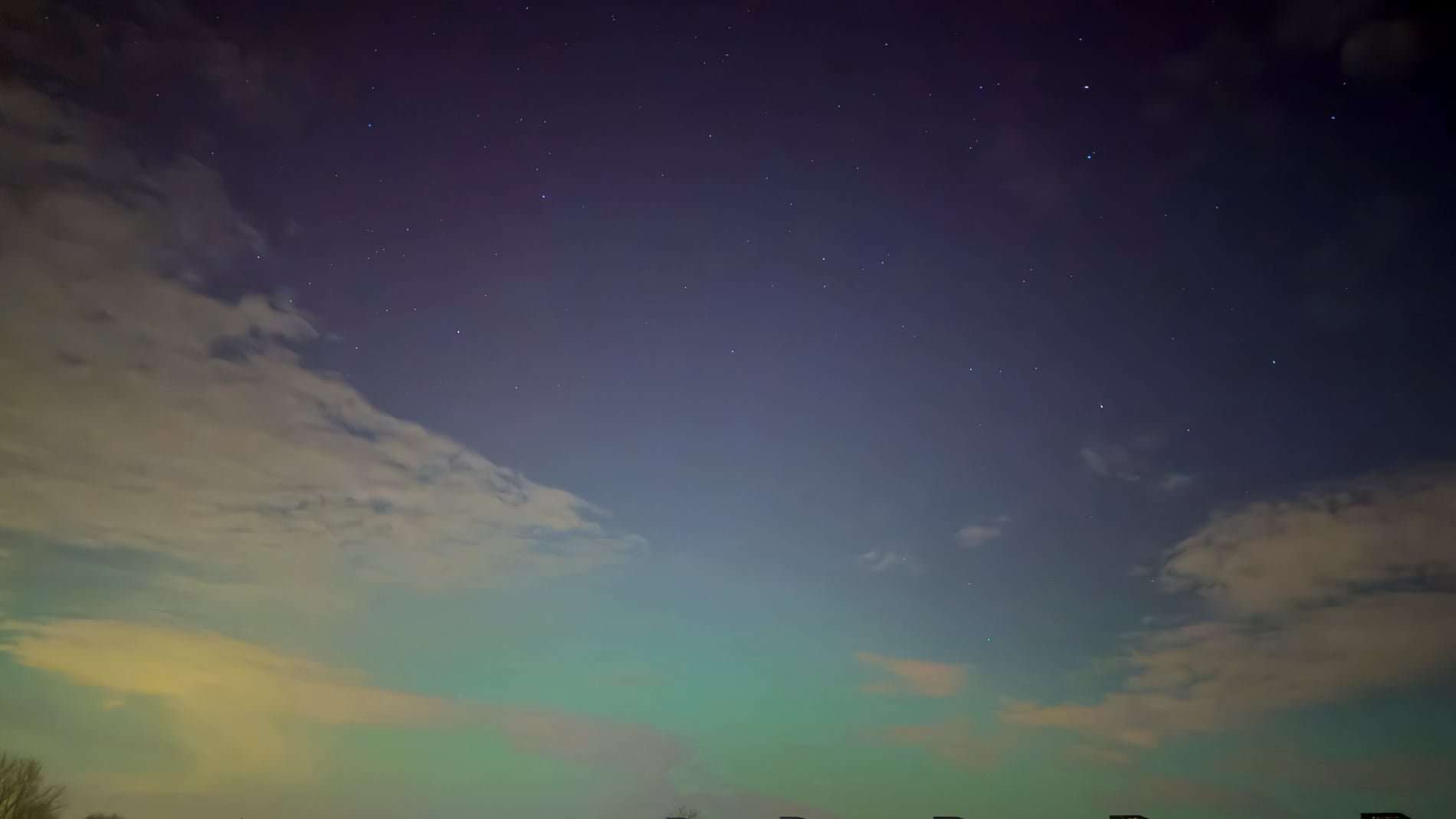 About 15 minutes later, the change was dramatic. The red aurora brightened and became clearly visible to the naked eye - even from within the city. That alone felt extraordinary, and it was clear the night had more in store. Soon after, a green band emerged, intensifying rapidly. Over the next fifteen minutes it climbed slowly higher, then split: one bright green arc remained fixed in the north, while even brighter green curtains formed above it, shimmering through the lingering red glow. These curtains drifted quickly across the northern sky.